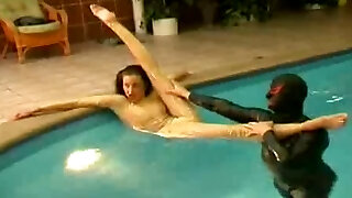 热橡胶的女孩在游泳池戏弄和squizing奶