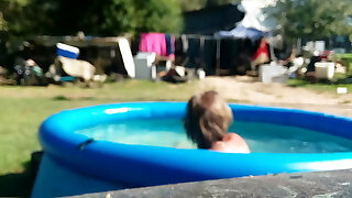 Smallish towheaded Bonnie Dolce和Josh在一个微不足道的游泳池里享受户外乐趣。