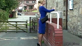 Lewd light haired MILF with ample rack gets rid of heels to show feet