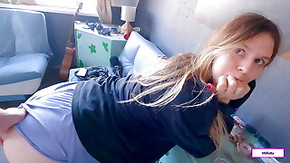 Redhead babe didnt notice how he went into her prepared asshole, and then she sat on top and got a creampie ass-fuck