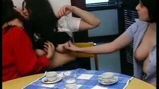 Two slim German chicks pleasing a loaded bone with their cock-squeezing holes